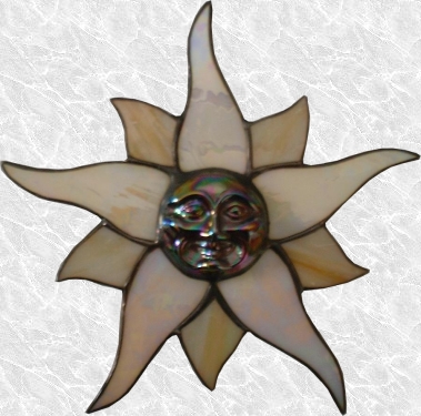 This suncatcher featurres a 3-dimentional face in the center. Faces come in amber, cobolt, teal, clear, and red. They are all iridized, and the face size is standard. To order using PayPal, click on the PayPal button. If a different color or size is desired, please let us know. For other ordering methods or questions, contact us onlineglass@onlineglass.net, or call us at (262) 257-0081.